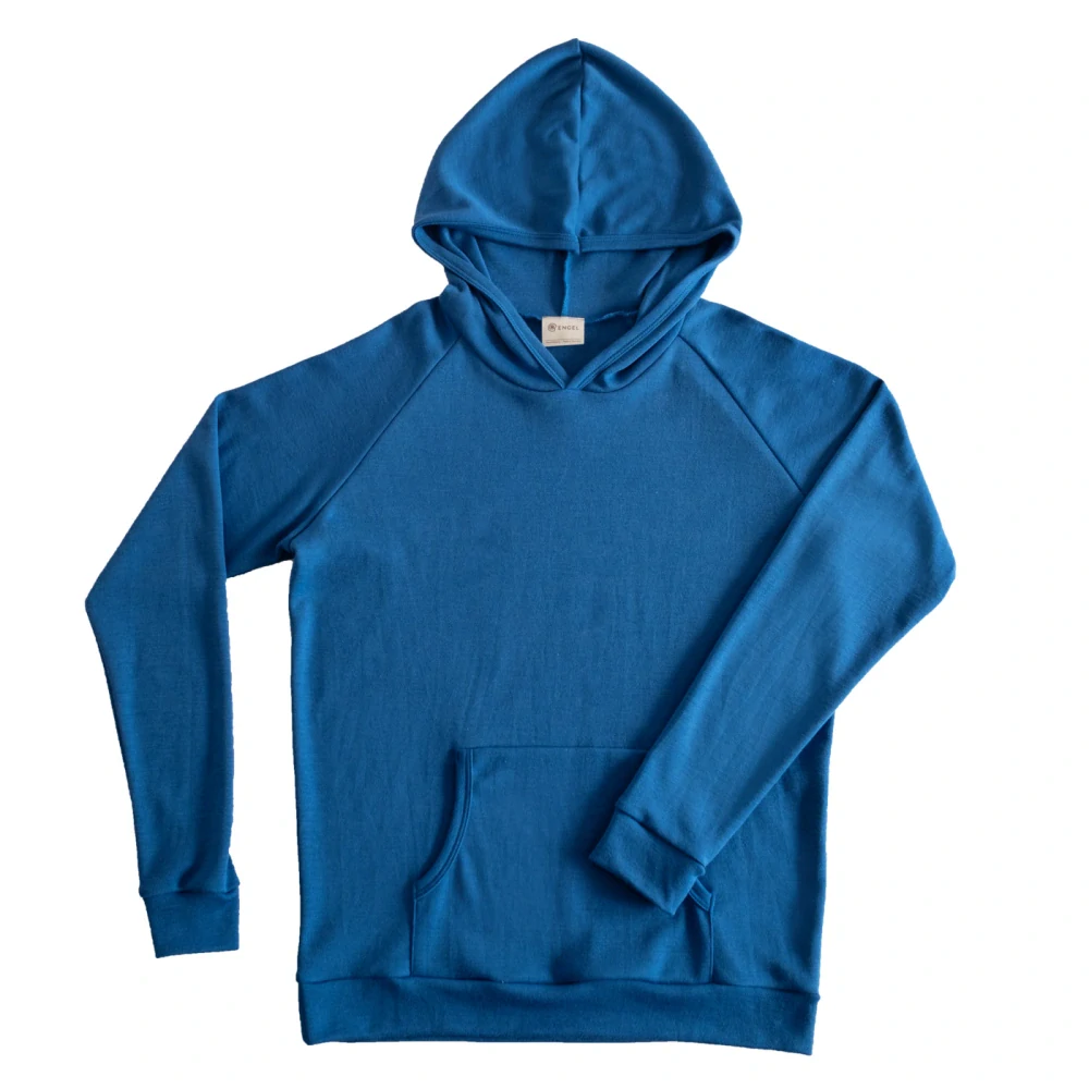 - Modrá mikina merino/hedvábí s kapucí a kapsou